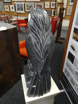 DARREN YEADON Carrara marble carving - a perched parrot on associated stand, with exhibition catalogue from the House of Commons, 73cms highLater note: the artist states that the material used is Kilkenny limestonethere is a mark on its right eye.the top of the wooden plinth has scratches.