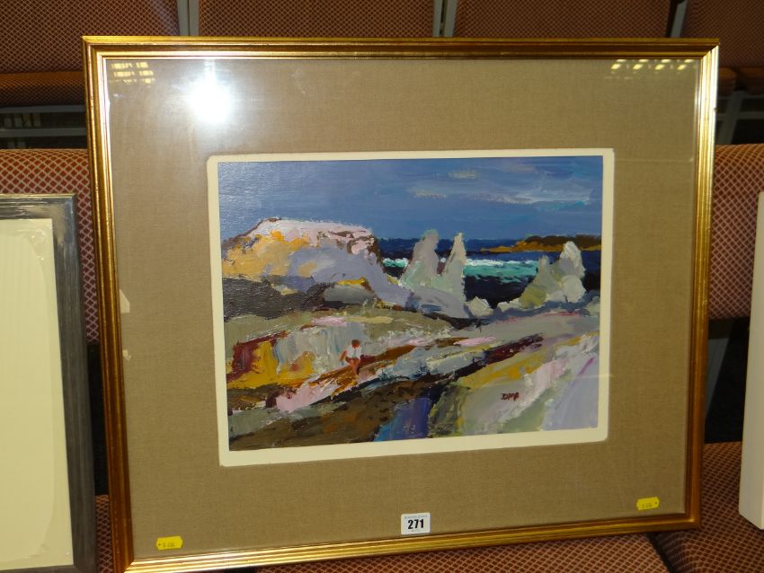 DONALD McINTYRE acrylic - seascape with seated figure, signed with initials and entitled on original label verso 'Rocks, Iona', 28.5 x 39cms