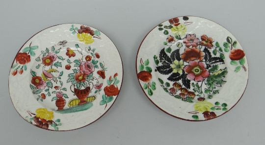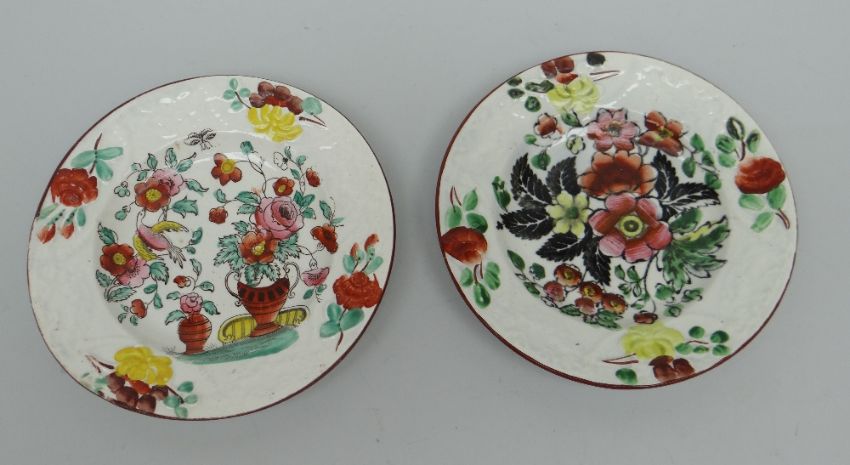 A GOOD PAIR OF BAKER, BEVANS & IRWIN CHILD'S PLATES with floral decoration and moulded borders within rust rims, 12.5cms diam