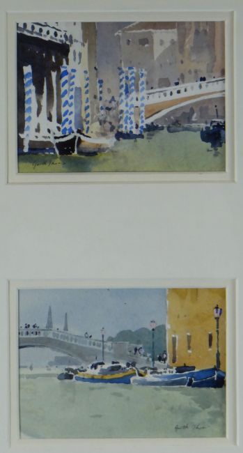 GARETH THOMAS watercolours, a pair framed together - Venice canals, signed, 10 x 13cms
