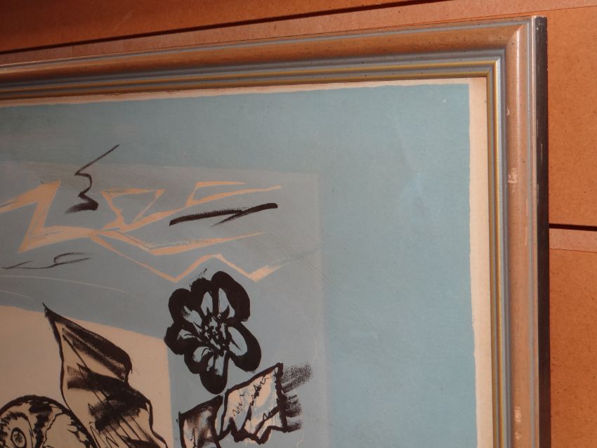 CERI RICHARDS one of twelve limited edition (9/50) lithographs for Six Poems by Dylan Thomas - entitled 'And Death Shall Have No Dominion', signed and dated 1965, 58 x 80cms Condition Report: some discolouration to paper with agethere is some slight yellowing to the print at the bottom around print number and signature. The framed has a few small chips and scratches. The glass is also very dirty