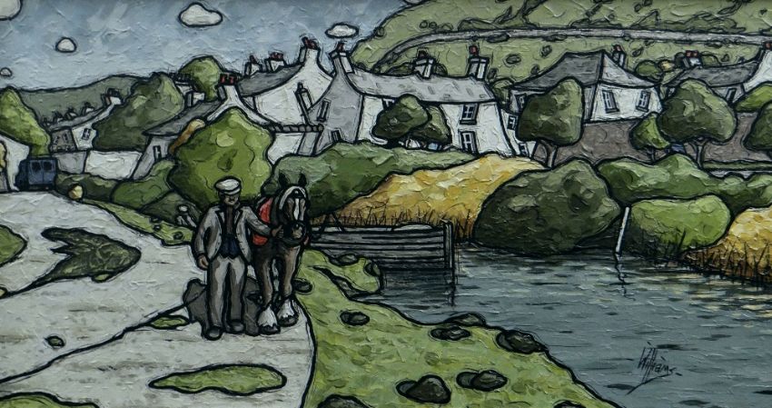 ALAN WILLIAMS acrylic on panel - figure walking with pony on tow-path, entitled 'Glamorgan Canal, Bunch of Grapes', signed, 38 x 68cms