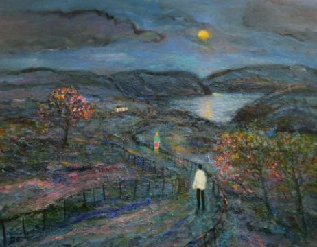 PETER JOHN JONES acrylic on canvas - landscape with two figures and Soar-y-Mynydd chapel in the background, entitled 'Meeting Anne' (the scene is from the poem 'Nonconformity' by the artist - Parthem Books), signed with initials, 71 x 92cms