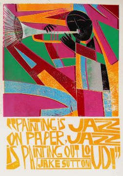 PAUL PETER PIECH limited edition (1/25) linocut - trumpeter with typography 'Painting is jazz on paper, jazz is painting out loud - Jake Sutton', signed in pencil and dated 1995, unframed, 63.5 x 45cms