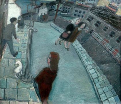 ERNEST ZOBOLE oil - South Wales valleys street scene with figures and dog, entitled verso 'The Valley Street No.59' and inscribed 1963 Welsh Art Council travelling exhibition, signed, 87 x 100cms