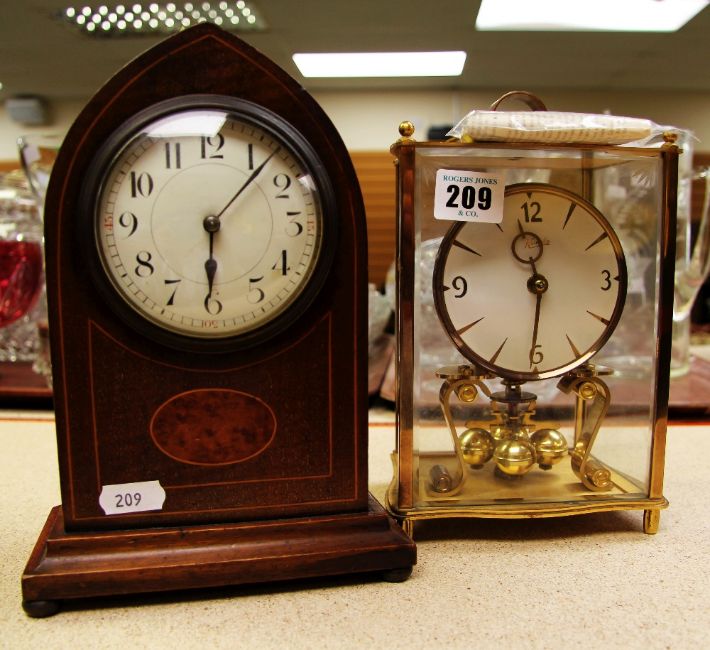 TWO MANTEL CLOCKS being a Kundo 400 Day Clock with rotary pendulum in brass effect and glass case with key and original instructions and (2) an inlaid mahogany architectural clock
