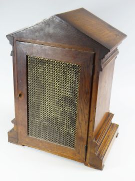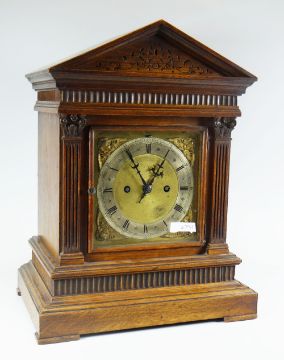 A FUSEE OAK ENCASED GERMAN-TYPE ARCHITECUTURAL MANTEL CLOCK, 41cms high