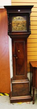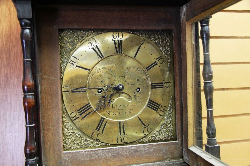 LATE C18TH-EARLY C19TH BRASS EIGHT DAY LONG CASE CLOCK, the face marked 'Evans Salop' with pendulum and single weight, the face engraved with floral and scroll decoration 210 cms high overall