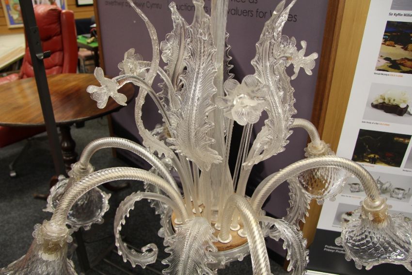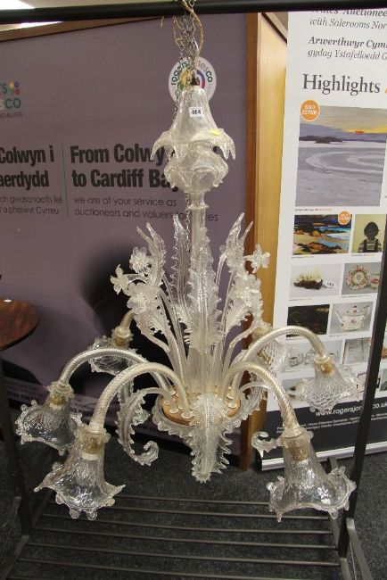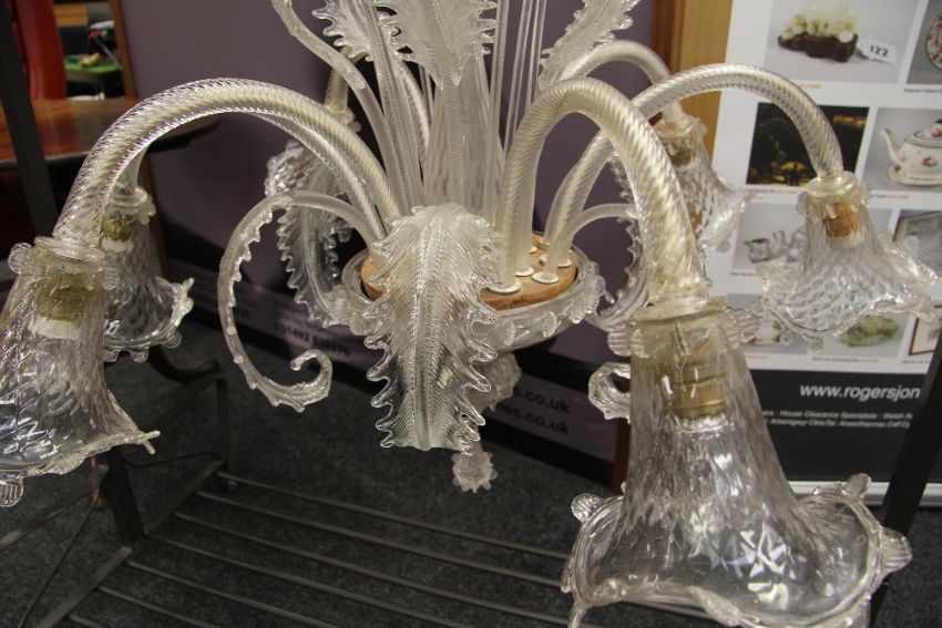 AN IMPRESSIVE SIX-BRANCH VENETIAN GLASS CHANDELIER the branches interspersed with branches of leaves and flower stems, approx. 120cms high (damage)