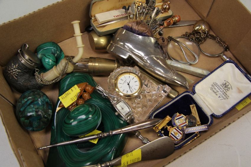 COLLECTABLES, A SMALL PARCEL to include malachite egg and stands, miniature miner's brass safety lamp, silver and steel shoehorn, magnifying glasses, Waterford crystal miniature mantel clock, National Savings pendants, white metal pin-cushion in the form of a shoe, various pins of shoehorn and other designs ETC