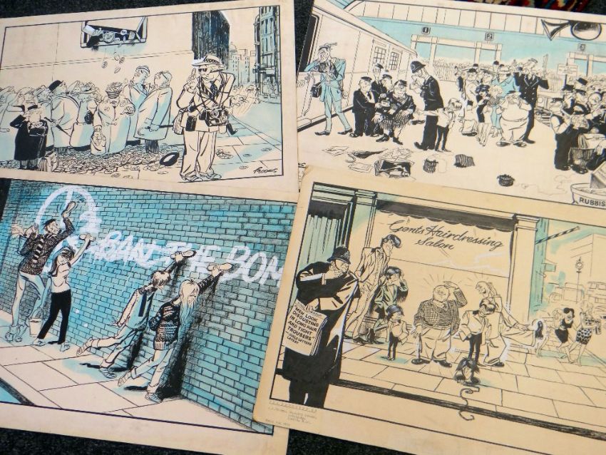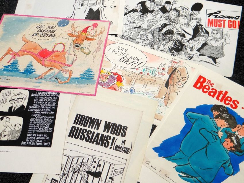FROOMS collection of original working cartoon drawings - including newspaper picture-boards, illustration of The Beatles, mostly signed, circa 1960s