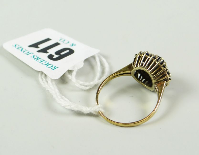 9 CARAT GOLD DIAMOND FLOWER HEAD DRESS RING (ONE STONE MISSING) 3.1 grams approx.