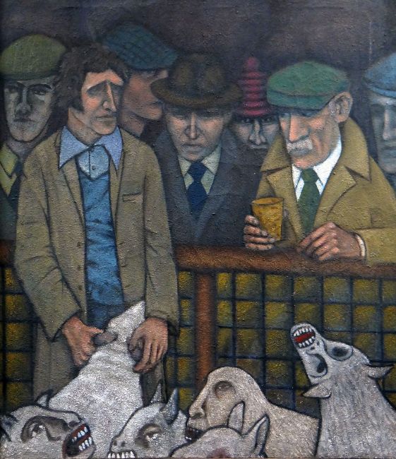 TONY GOBLE oil on canvas - amusing agricultural scene with seven male characters at a livestock market and sinister looking sheep below, 119 x 104cms