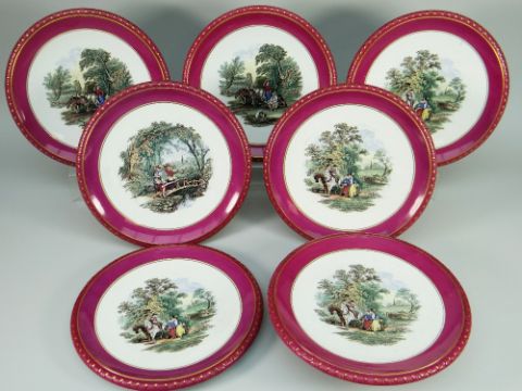 SIX ASHWORTHS POTTERY TRANSFER PLATES AND MATCHING CAKE STAND each with a scene of English village life, the bases marked for Cardiff retailer Primavesi and Sons