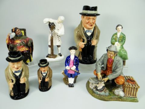 PARCEL OF ROYAL DOULTON CHARACTERS including a graduated trio of Winston Churchill jugs, a matt-finish Bon Appetite HN2444 (8 total)