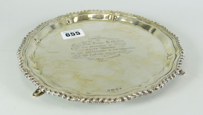 SMALL SILVER ENGRAVED SALVER raised on three hoof-type feet, presentation for silver wedding 273 grams