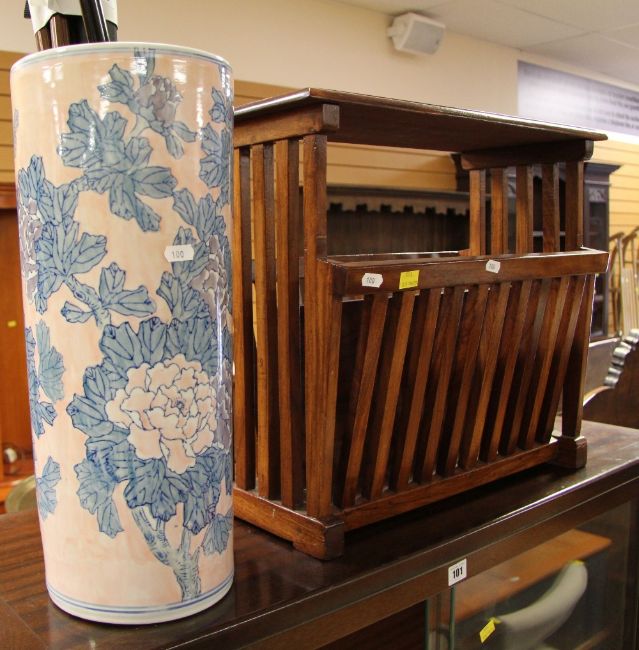 A REPRODUCTION THREE-DRAWER SLOPED BUREAU together with a reproduction magazine rack, a stick stand and contents