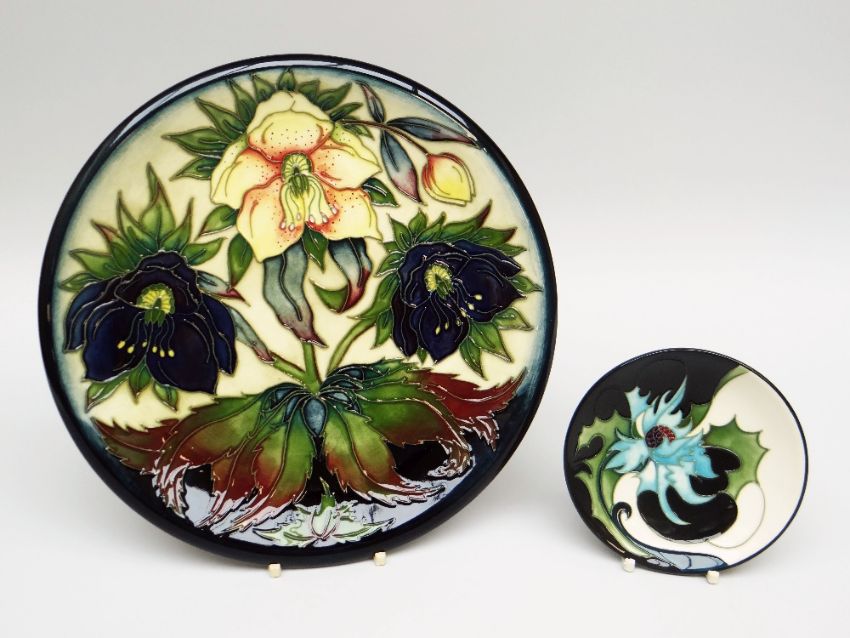 A MOORCROFT POTTERY DISPLAY DISH in the 'Hellebore' pattern model no. 78310 designed by Nicola Slaney (boxed), 26cms diam; together with a smaller Moorcroft pottery dish dated 2006