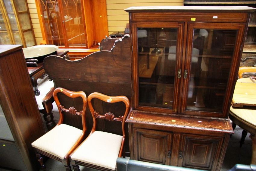 AN ANTIQUE INLAID BOOKCASE CUPBOARD OF SMALL PROPORTIONS together with two antique balloon back dining chairs