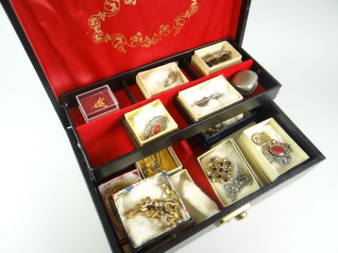 JEWELLERY BOX CONTAINING ASSORTED COSTUME AND DRESS JEWELLERY to include bar brooches, plated sovereign holder, pearls, bracelet ETC