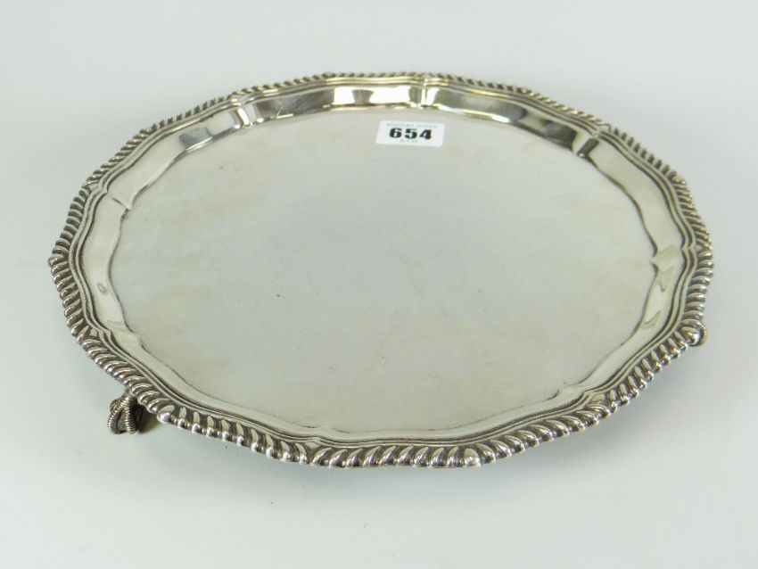 SILVER PIECRUST EDGE SALVER raised on three ball and claw feet, Sheffield hallmarked 18 troy ounces, 564 grams