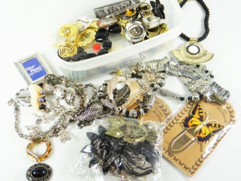 COSTUME JEWELLERY, A SMALL TUB CONTAINING earrings, necklaces, bar brooches, butterfly bookmarks ETC