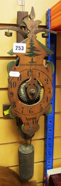 A REPRODUCTION ANTIQUE BLACK FOREST STYLE SKELETON WALL CLOCK