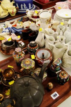 A QUANTITY OF MIXED ORNAMENTS including modern Cloisonne, ornamental shoes, Parian jugs ETC