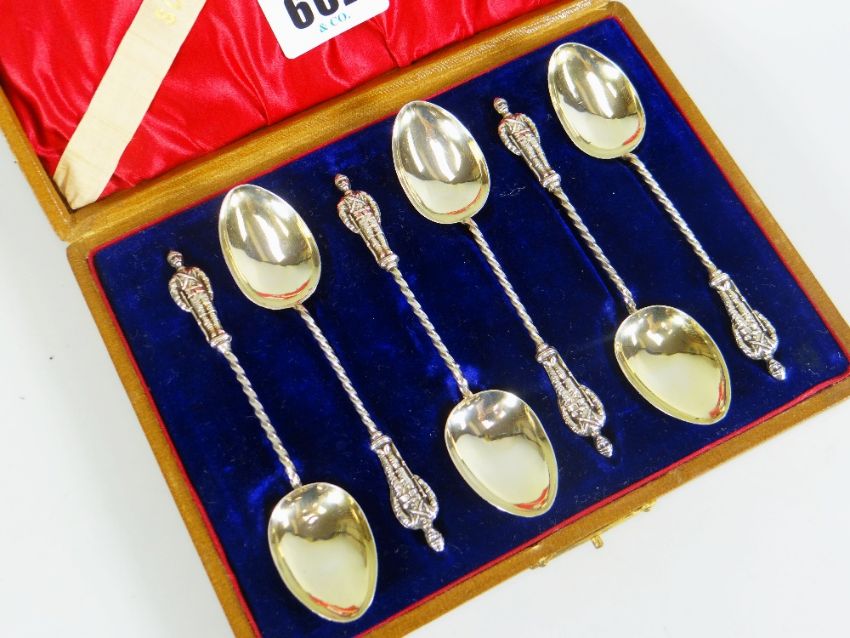 CASED SET OF SIX SILVER TEA-SPOONS 'Soldiers of the Queen'
