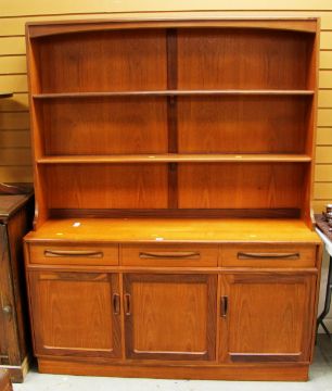 A G-PLAN OR G-PLAN STYLE TEAK DRESSER with three cupboard base, three drawers and an open rack