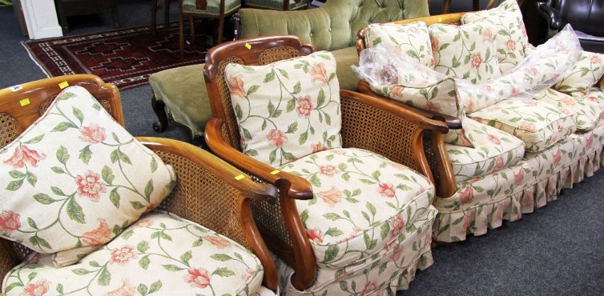 A THREE PIECE BERGERE SUITE comprising three seater sofa and a pair of armchairs and having later tasteful floral upholstery
