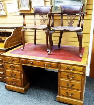 A LARGE VINTAGE OAK PARTNER'S DESK having nine drawers and single cupboard and single drawer verso with red leather writing surface and accompanied by two vintage chairs, 151cms wide x 102cms deep