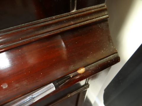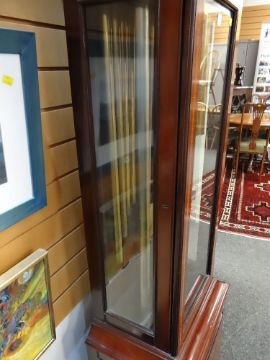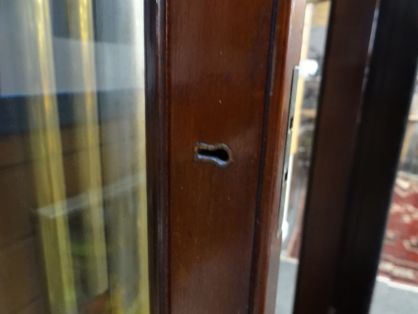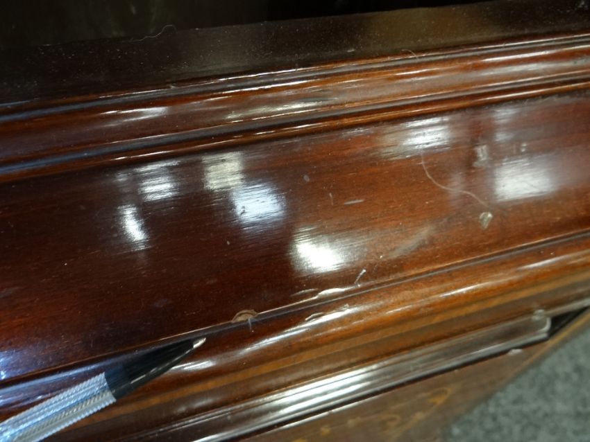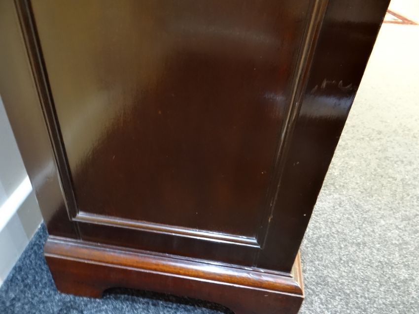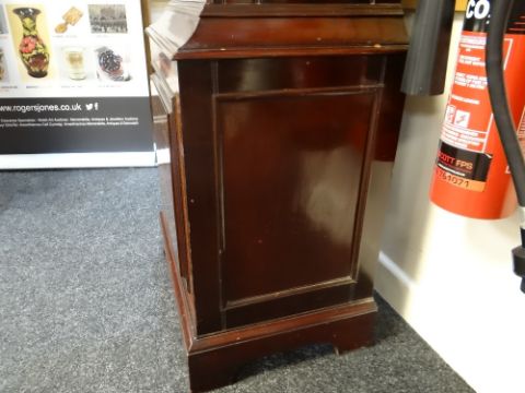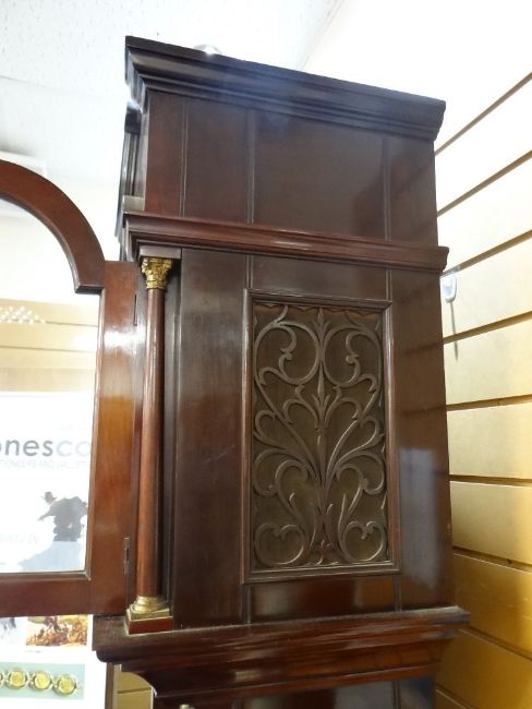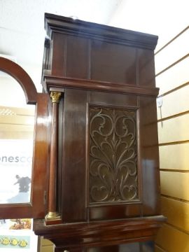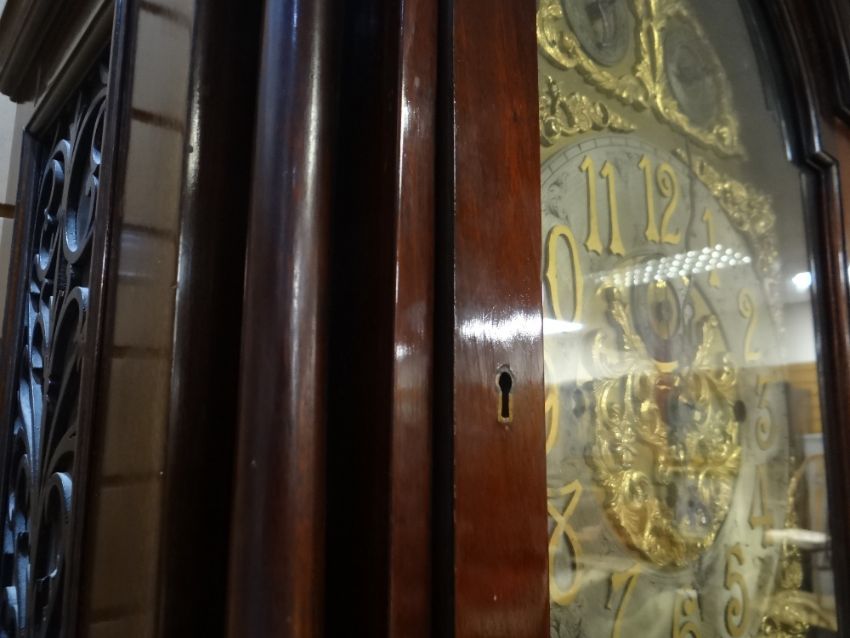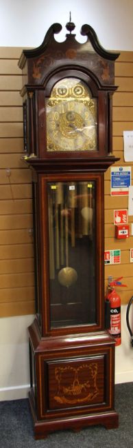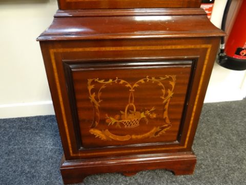 A GOOD EDWARDIAN INLAID MAHOGANY LONGCASE CLOCK having a filigree brass and silvered dial bearing Arabic numerals and with silent / chime dial and Whittington / Westminster dial, the hood with swan-neck pediment and with arched glass over a inlaid mahogany trunk gazed on three sides over a fruit-basket marquetry panelled base, 252cms highIt winds well and it chimes well.It does have it’s winding key but the door key is missing, but it is open.There are a few faint surface scratches which are not very noticeable and could probably be cleaned up.There is one small piece of wood missing from one side in amongst the patterned side.All the glass is good