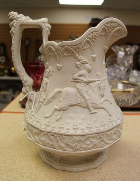 A PARIAN JUG the body depicting a relief tournament scene with jousting competitors, marked for Ridgeway & Sons
