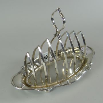 GEORGE V SILVER SIX SECTION TOAST RACK OF OVAL FORM raised on four ball feet with loop handle. Sheffield 1920, Makers mark R & B, 20 cm wide, 9 troy ounces approximately (repaired)
