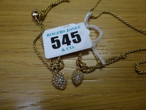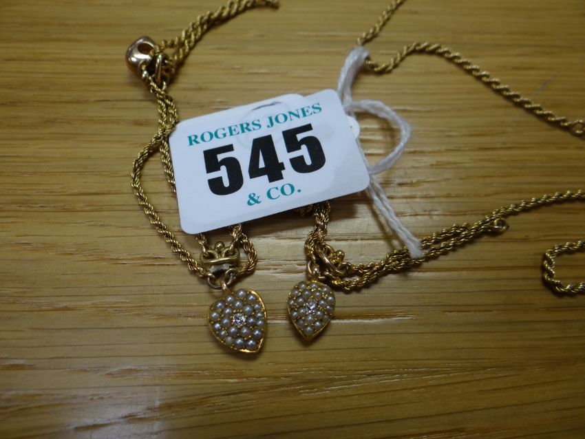 BELIEVED GOLD ROPE TWIST NECKLACE with three suspended heart shaped pendants adorned with seed pearls and centred diamond, not hallmarked, 10gmsThe length of the hearts are 8 & 9mm not including the loops.Good overall condition, there is no significant damage.