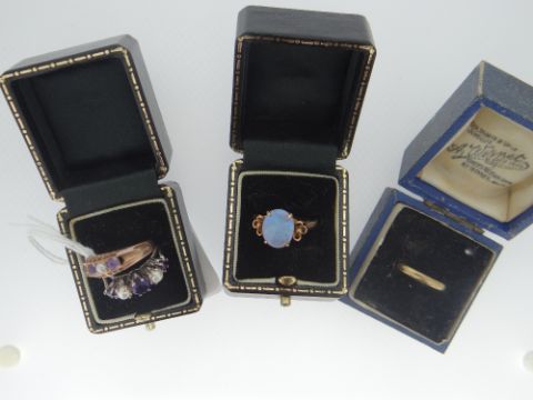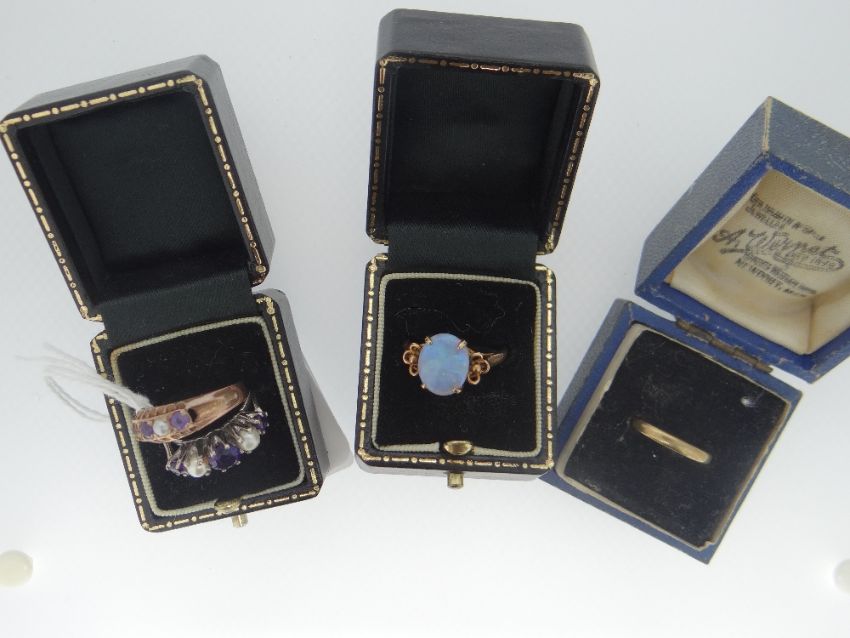 FOUR SUNDRY RINGS including 9ct opal ring, 18ct white gold seed pearl and amethyst ring, yellow gold wedding band (hallmark unclear) ETC
