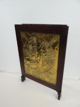 LATE 20TH CENTURY BRASS ARTS & CRAFTS PANEL with repousse decoration of circular scene with figures harvesting fruit, in later wooden fire-screen frame, 60 x 48cms (panel only)