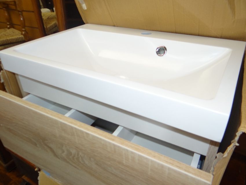 BOXED AS NEW DRIFT STONE RESIN SINK / BASIN together with two-drawer wall unit and two vintage mirrors