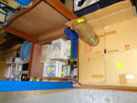 TRAY OF BOXED WEDGWOOD, commemorative glassware, suitcase of Royal Doulton 'The Snowman' figures ETC