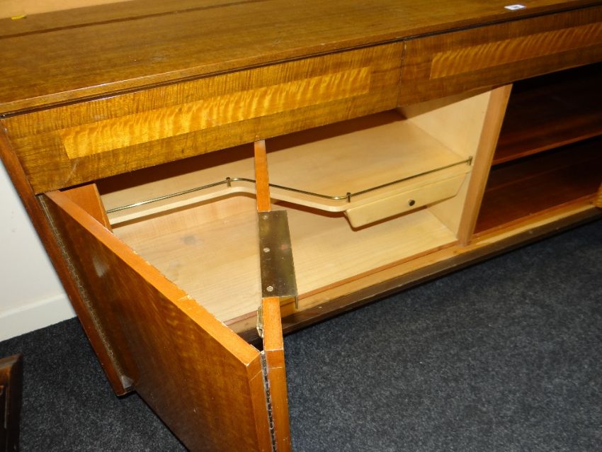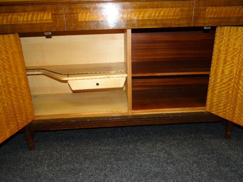 MID-CENTURY LEBUS POLISHED SIDEBOARD having three drawers over two concertina doors with cocktail cabinet interior and shelves, bears label, 183cms wide