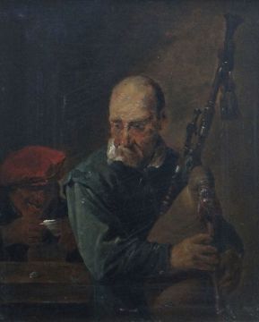 19TH CENTURY VIENNA SCHOOL oil on panel - a bearded figure in the foreground with bagpipes and a grinning capped figure behind, inscribed verso 'Vienna 1883', 28 x 22cms