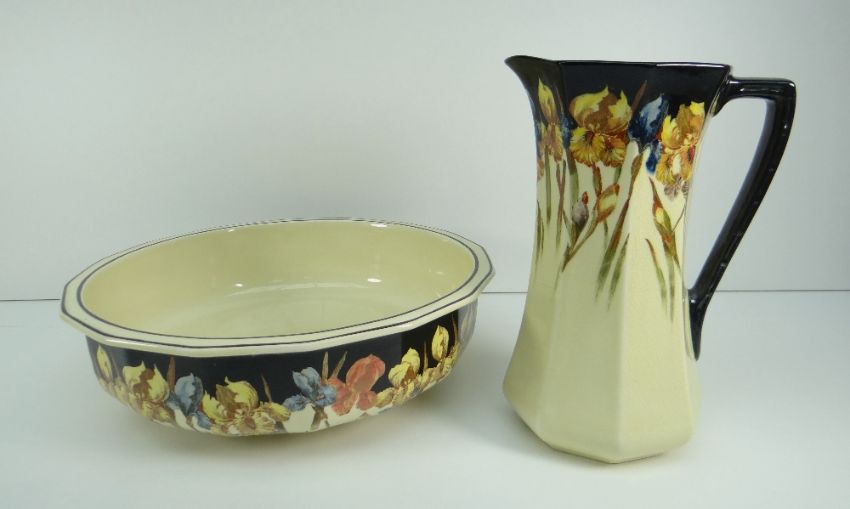 ROYAL DOULTON POTTERY TOILET JUG & BASIN of faceted form and decorated with tall flowers to a cream and blue ground