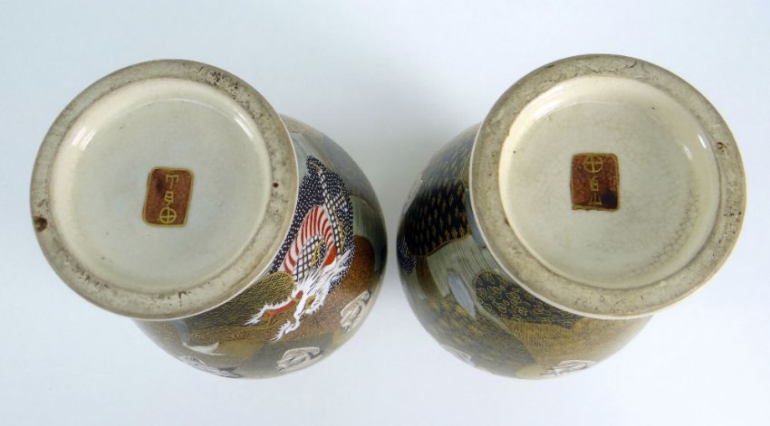 PAIR OF SATSUMA 'THOUSAND FACES' BALUSTER VASES having circling dragon to the neck and with character marks to the base, 26cms high
