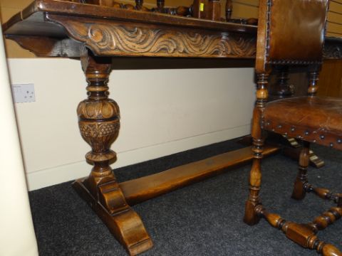 FINE QUALITY MID CENTURY JACOBEAN REVIVAL DINING TABLE & FOUR CHAIRS, the table with floor level stretcher, carved foliate and berry supports, carved freize, chairs with studded brown leather upholstery