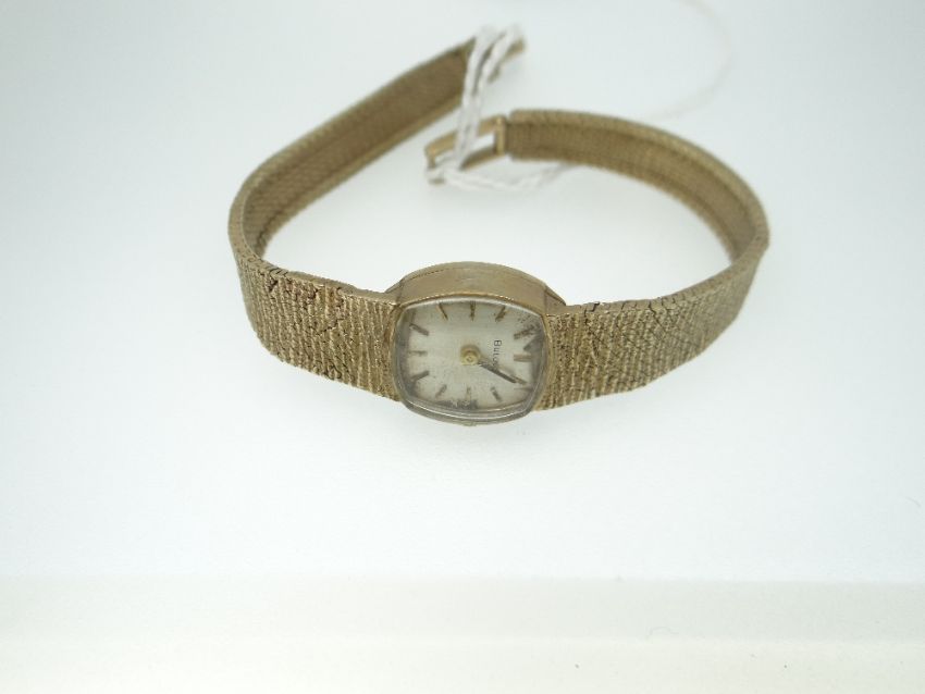 LADIES VINTAGE BULOVA BRACELET WRISTWATCH in 9ct yellow gold, the bracelet of tapered textured form, 20gms total