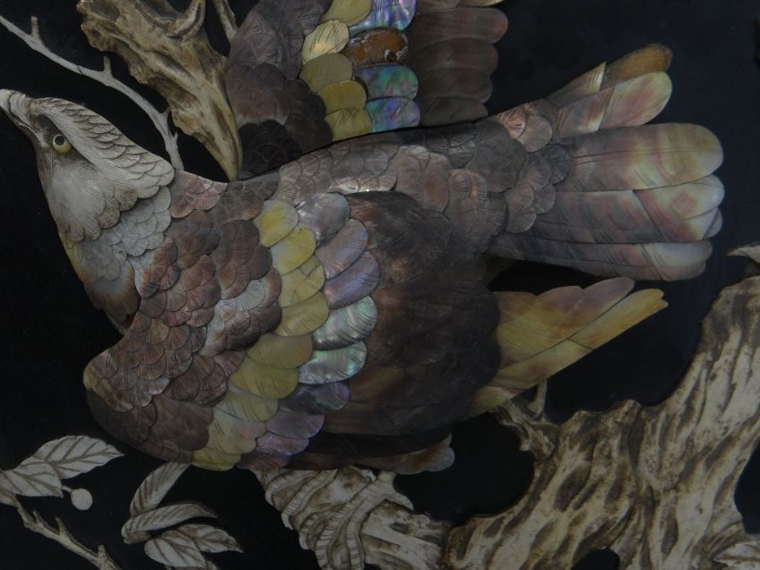 PAIR OF JAPANESE MEIJI PERIOD MOTHER OF PEARL AND IVORY COLLAGES on black lacquer panels, depicting hawks perched in trees, both with signature cartouche, 106 x 52cms