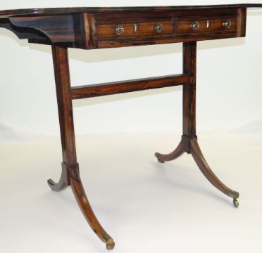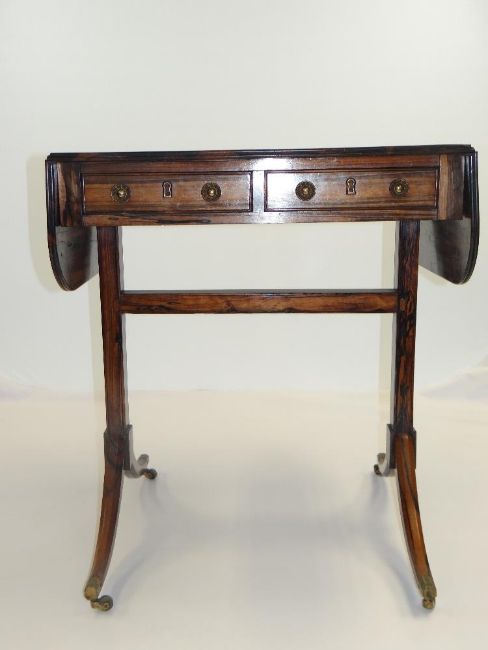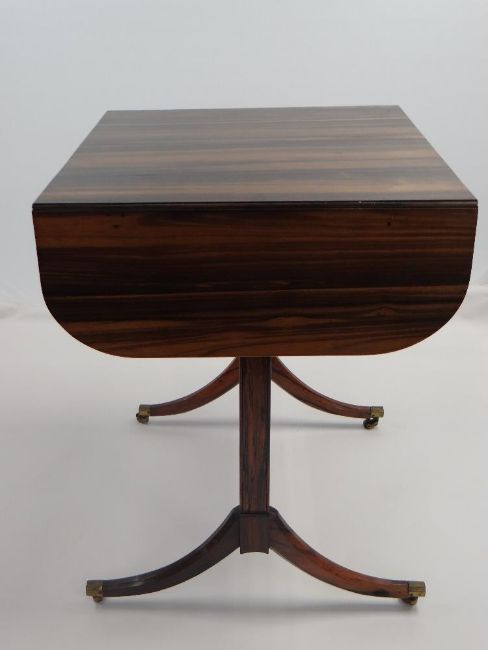 REGENCY COROMANDEL WOOD SOFA TABLE having two frieze drawers and two opposing dummy drawers, twin reeded and rounded flaps over splayed stretcher-less supports, brass handles, brass terminals and castors, 106cms extendedCondition Report: Marks to top commensurate with age, there’s a small split on foot entering castor but not affecting use.64cms wide with side flaps down60cms deep76cms high