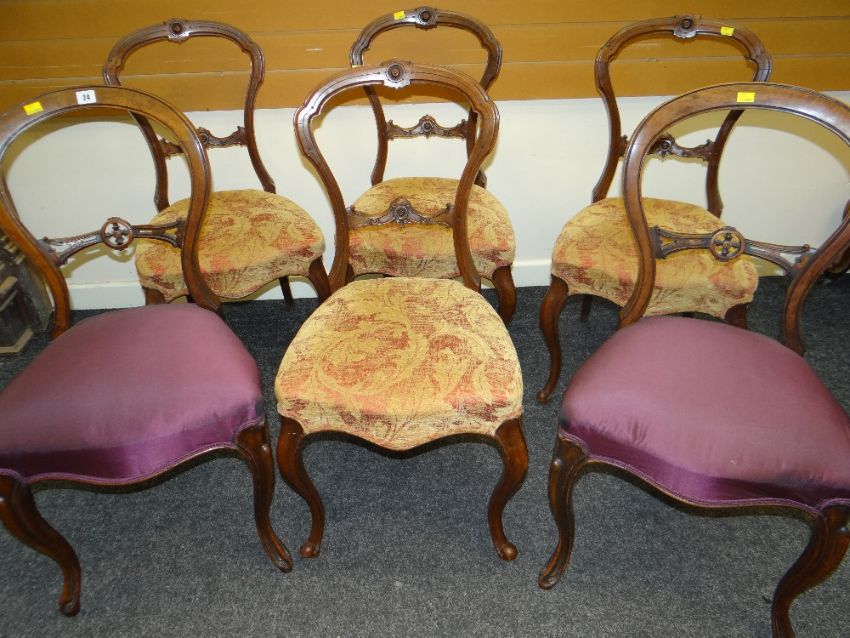 SET OF FOUR VICTORIAN DELICATE DINING CHAIRS OF CARVED BALLOON FORM with stuff-over cushion seats; together with two non-matching similar