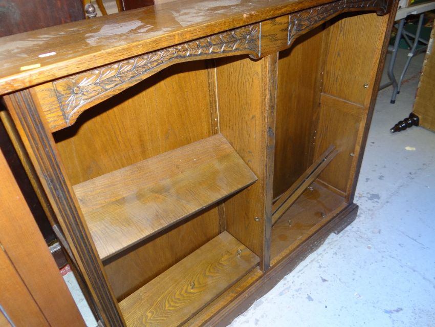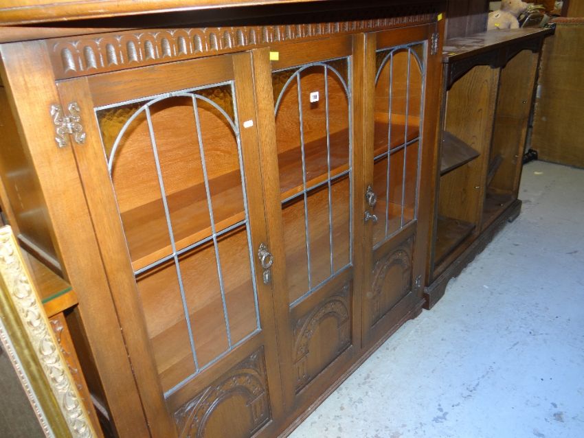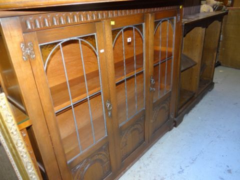 ANTIQUE REPRODUCTION CARVED THREE DOOR GLAZED BOOKCASE, together with a similar open bookcase and a marquise shaped coffee table